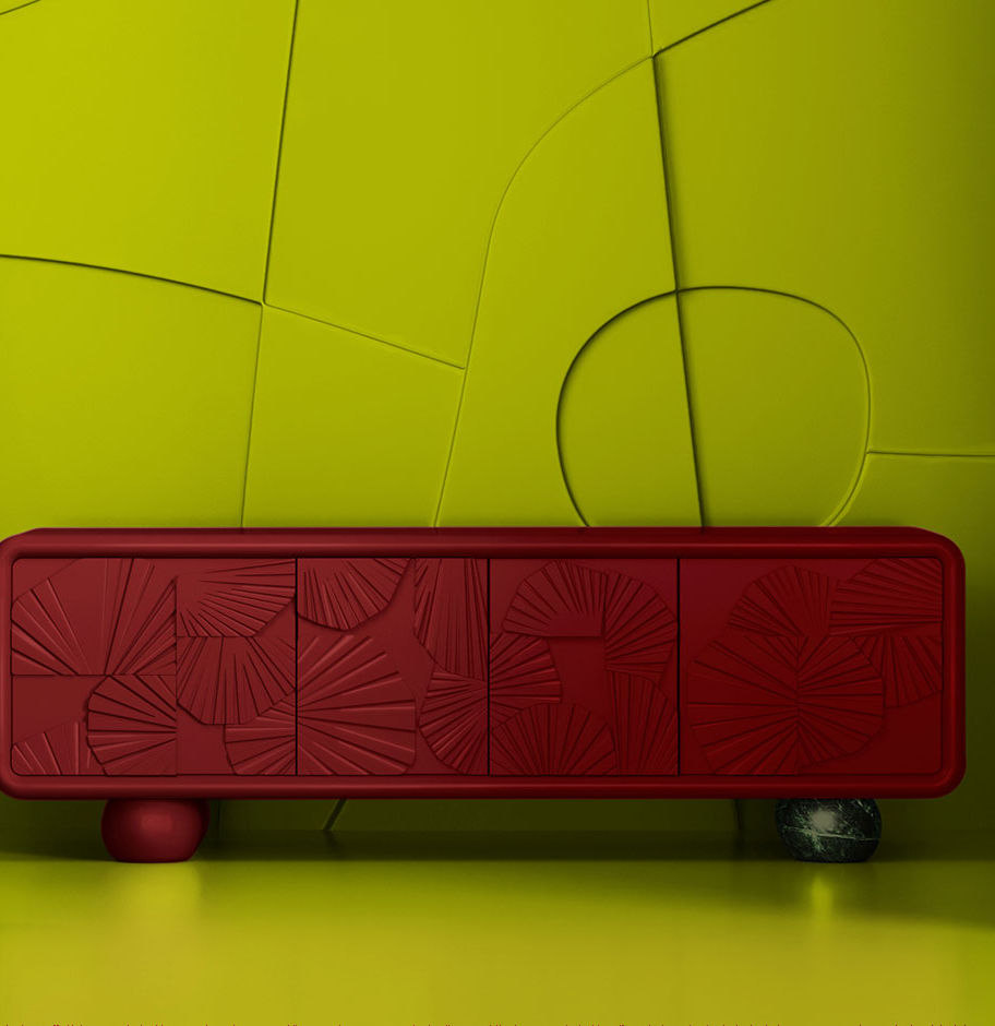 O Aparador Mon-Ooh é uma verdadeira peça de arte funcional. O seu design ousado distingue-se pelas portas com painéis esculpidos em relevo, inspirados em formas orgânicas e motivos naturais, que criam um jogo de luz e sombra surpreendente.
