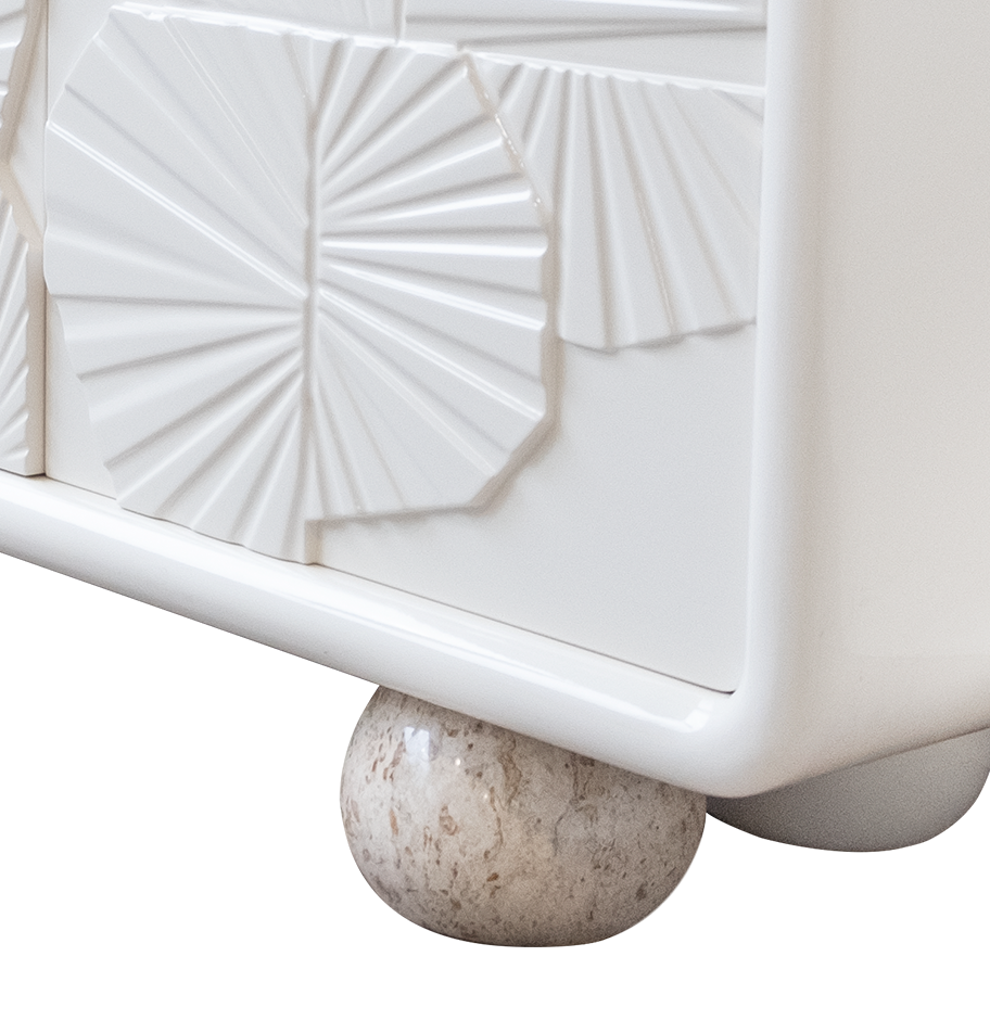 Com estrutura em MDF lacado e contornos arredondados, este aparador evoca suavidade e fluidez visual. A base com pés esféricos adiciona um toque lúdico e escultural, equilibrando modernidade e expressão artística.