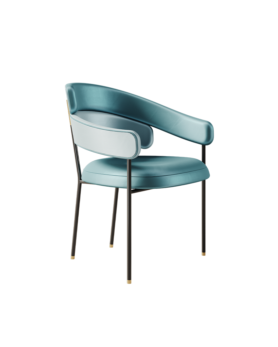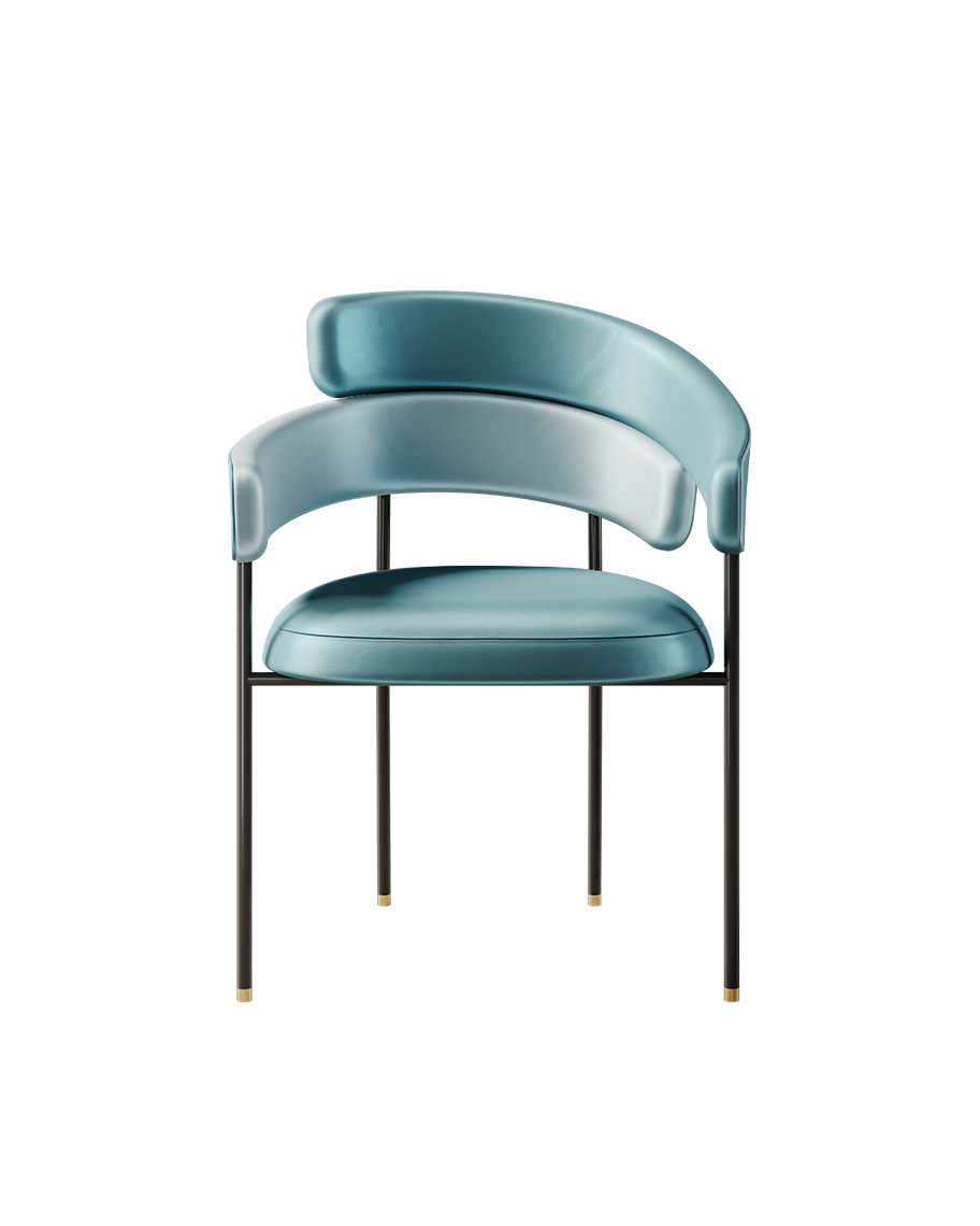A Cadeira de Jantar Marlene combina um visual futurista e refinado, com encostos curvos superpostos que oferecem suporte ergonômico e um visual escultural. O assento generosamente estofado em couro ou tecido sofisticado repousa sobre uma estrutura de aço tubular com acabamento em preto fosco e detalhes em latão nas extremidades dos pés.