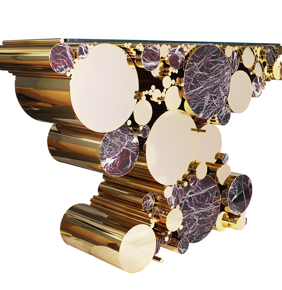 A Consola Wandelust transcende o conceito tradicional de mobiliário. Sua estrutura orgânica é formada por círculos sobrepostos de latão polido, mármore natural e detalhes em vidro texturizado, como se fossem planetas flutuando em um sistema cósmico. O tampo em vidro transparente proporciona leveza visual, permitindo que a base torne-se a verdadeira protagonista do ambiente. Ideal para interiores ousados, luxuosos e com forte apelo artístico.