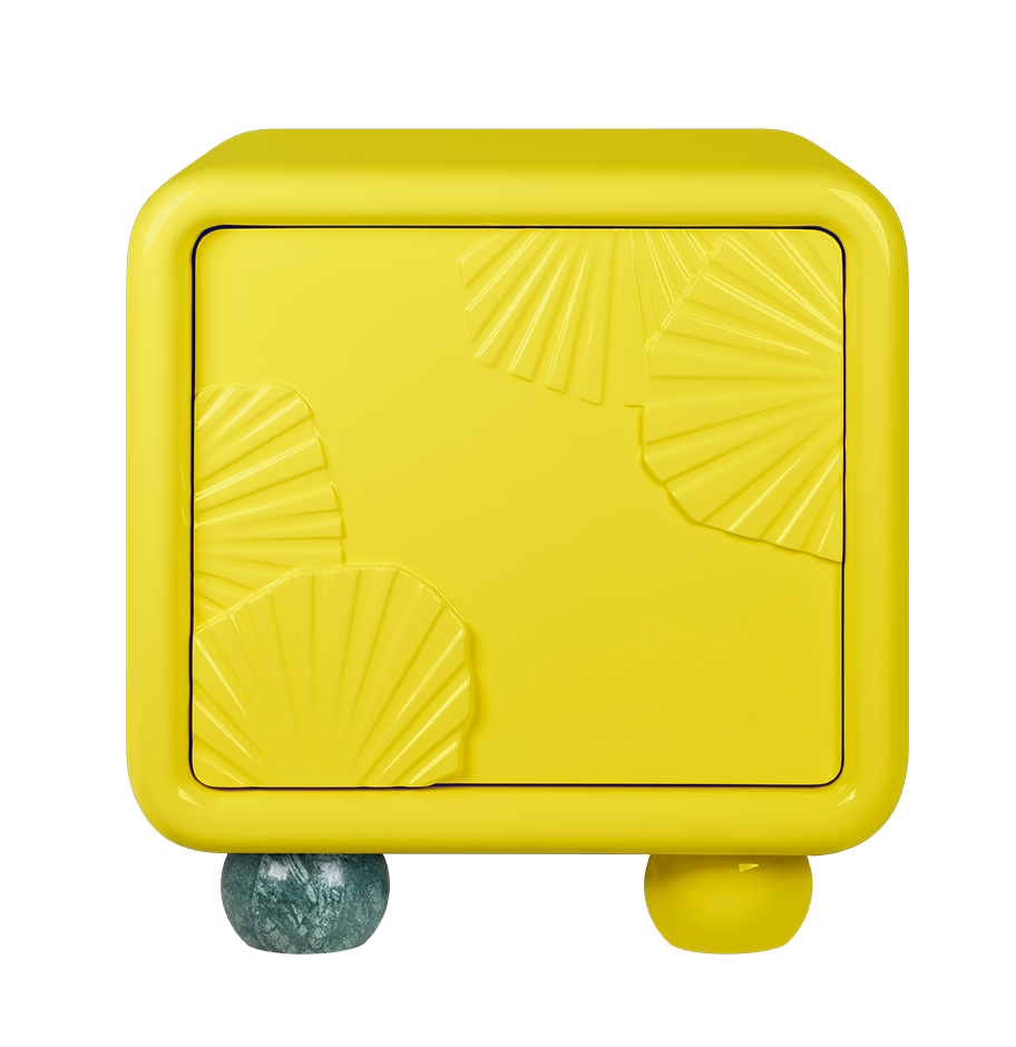 A Mesa Cabeceira Mon Ooh é uma peça de design escultural com uma estética suave e elegante. O seu corpo em laca brilhante apresenta cantos arredondados e detalhes texturizados inspirados em formas orgânicas, remetendo a conchas ou pétalas. A base é composta por esferas assimétricas, uma em laca e outra em pedra natural, conferindo estabilidade e originalidade. Um toque de sofisticação serena para quartos contemporâneos e ambientes artísticos.