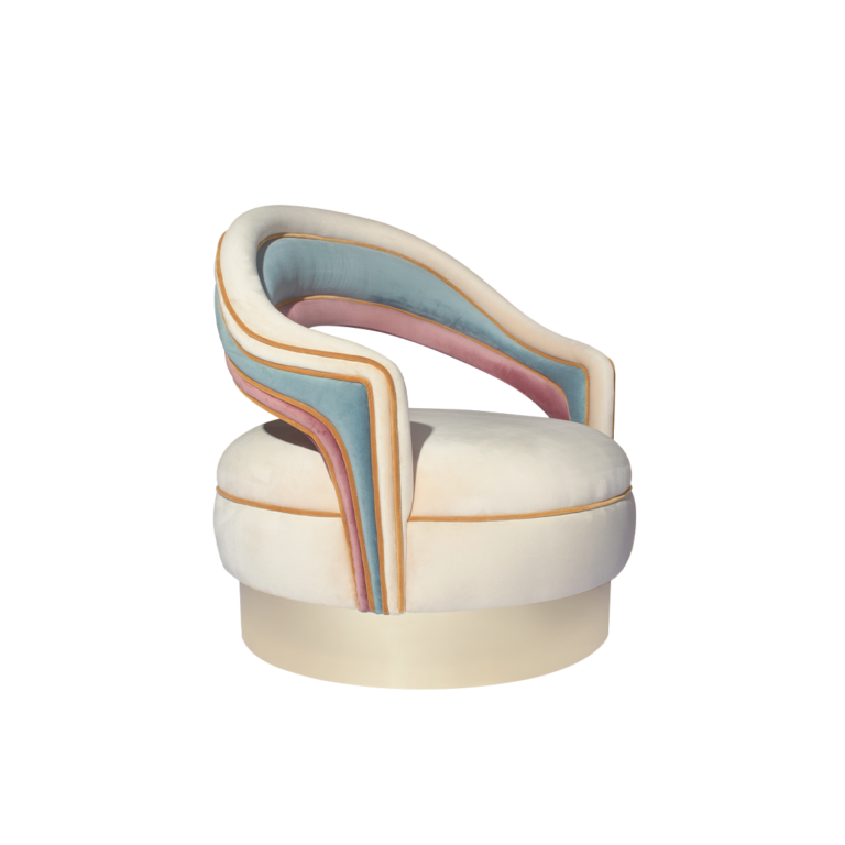 A Poltrona Charisse é uma celebração do glamour vintage com uma pitada lúdica. Sua forma semicircular acolhe o corpo com suavidade, enquanto o estofado em veludo multicolorido — nos tons delicados de creme, azul e rosa — cria um visual nostálgico e sofisticado. A base giratória em acabamento laqueado branco perolado adiciona funcionalidade e charme à peça, tornando-a ideal para espaços de estar refinados ou camarins com personalidade.