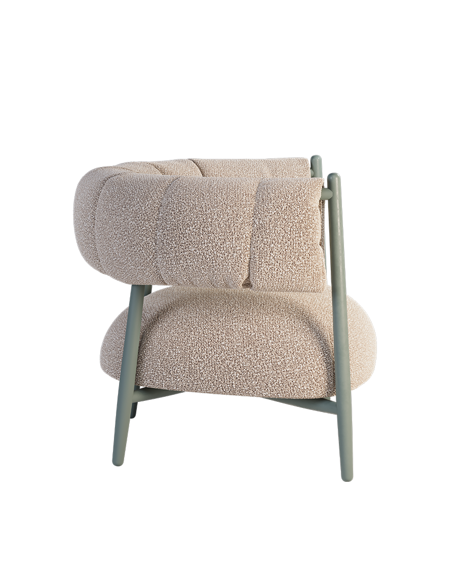 A Poltrona Ellen representa o encontro perfeito entre conforto envolvente e estética contemporânea. Sua estrutura metálica esguia e minimalista, em tom verde-acinzentado fosco, contrasta com o volumoso estofado em bouclé bege, que proporciona uma experiência tátil e visual única. O encosto curvo abraça quem senta, oferecendo suporte ergonômico e um visual de sofisticação descontraída, ideal para compor ambientes modernos com um toque escandinavo ou brutalista suave.