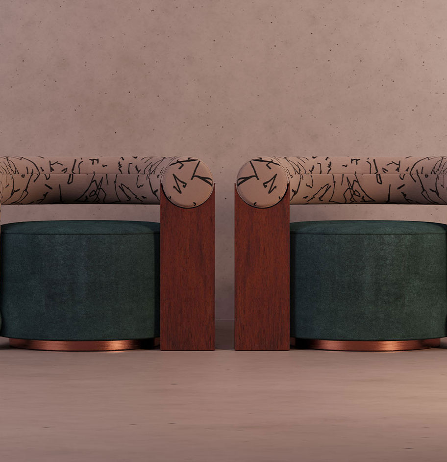 A Poltrona Galatea é uma peça escultural que transcende o design convencional com sua estética ousada e irreverente. Sua estrutura cilíndrica estofada em veludo azul profundo contrasta com o encosto angular em veludo laranja queimado, criando um jogo cromático impactante. Um detalhe marcante é a esfera de mármore verde que serve de base para um dos apoios de braço, enquanto o outro lado repousa sobre uma estrutura sólida em madeira natural. Uma poltrona que une arte, design e conforto em perfeita harmonia.