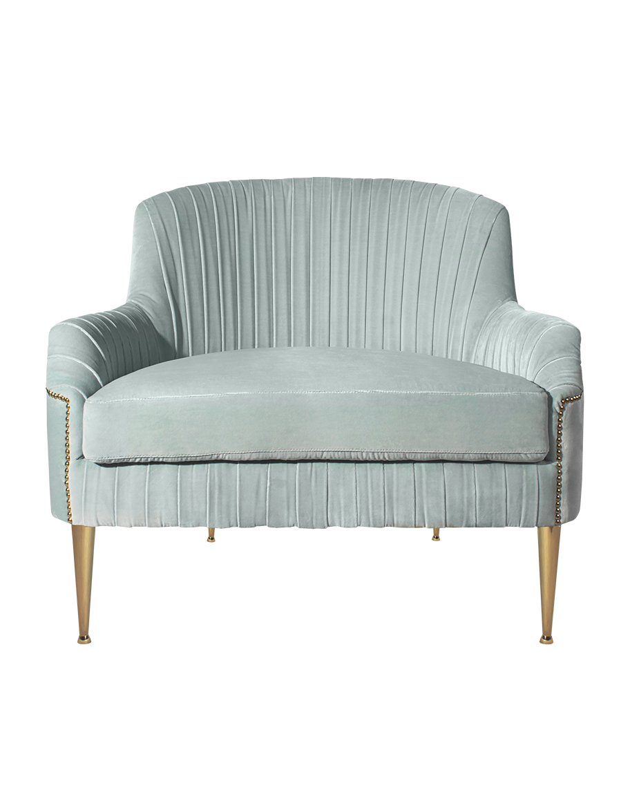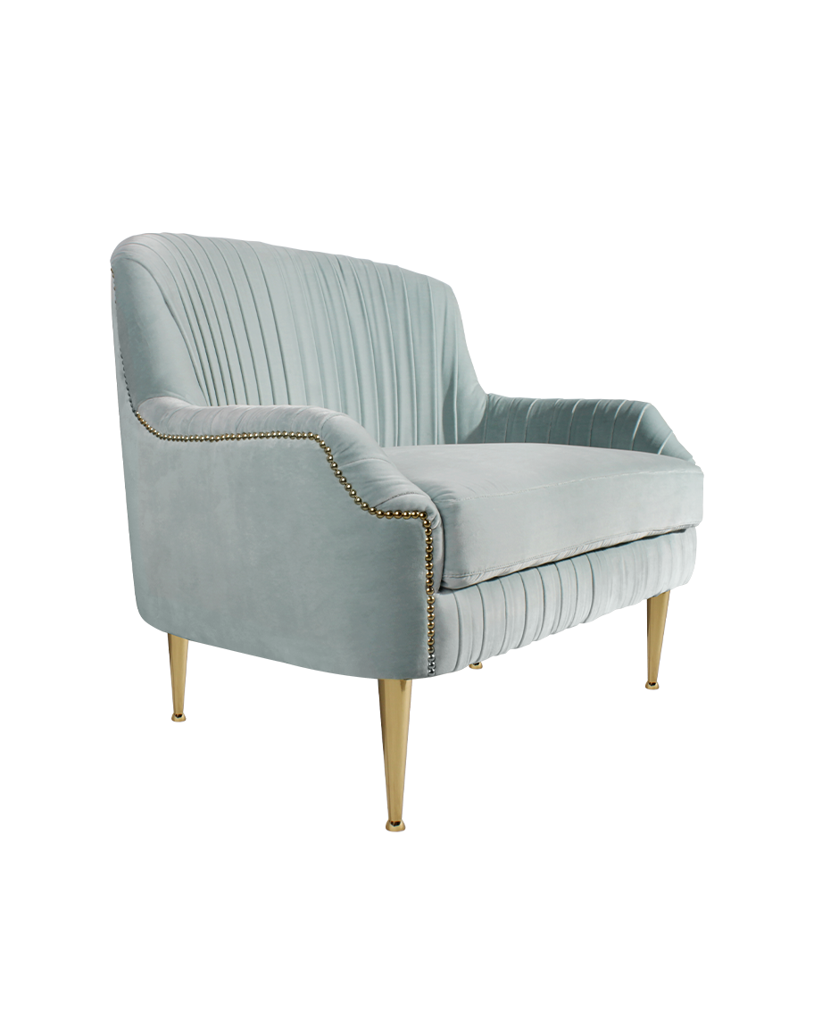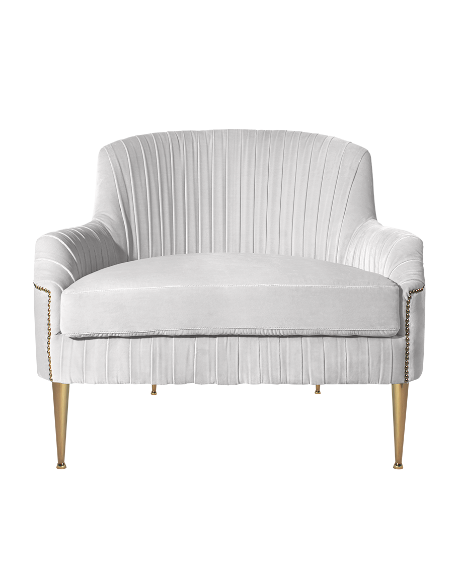 Inspirada na elegância atemporal da era dourada de Hollywood, a Poltrona Greta é uma peça que exala sofisticação e feminilidade. Com linhas curvas e delicadas, esta poltrona apresenta um estofamento em veludo suave, enriquecido com detalhes de pregas verticais no encosto e base, além de acabamento com tachas metálicas douradas que realçam sua silhueta clássica. As pernas metálicas douradas cônicas reforçam a estética refinada, tornando-a ideal para salas de estar, quartos e ambientes de luxo.