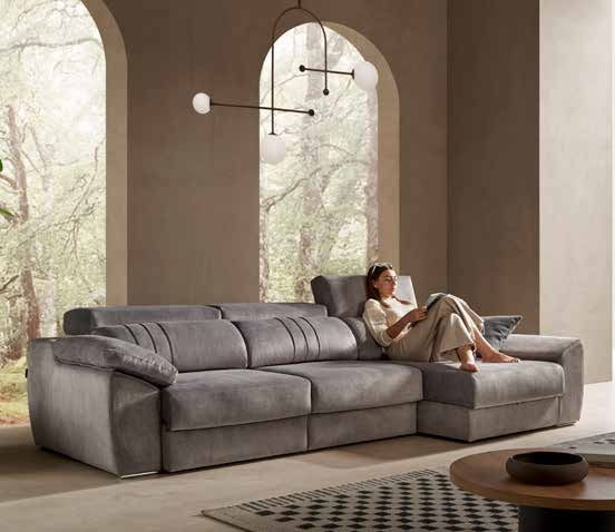 Com estrutura em madeira de pinho e assentos Acofoam, oferece conforto consistente e durabilidade. O módulo chaiselongue fixo com arcón integra-se perfeitamente e inclui almofada decorativa. As cabeceiras reclináveis em espuma suave adaptam-se à cervical, proporcionando apoio extra.
